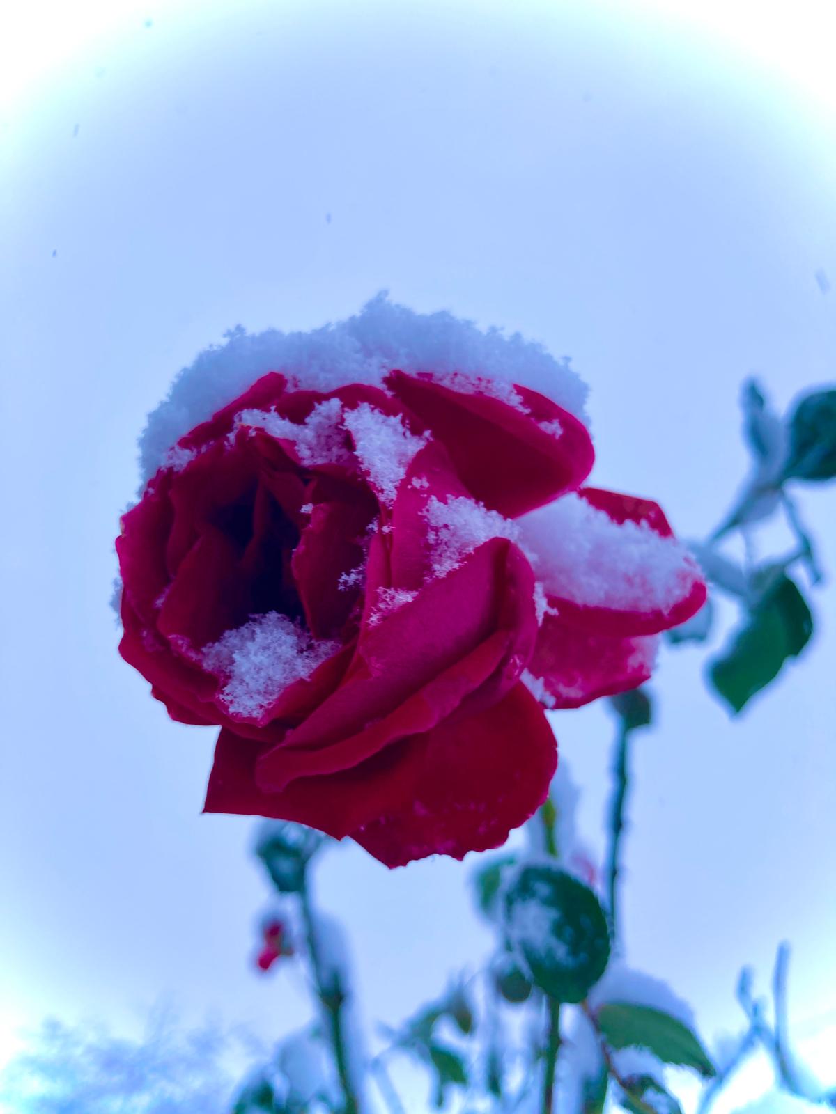 Een paar dagen later smelt de sneeuw. De roos staat er nog. Ze oogt sterk, fier zelfs. Maar wie dichterbij kijkt, ziet iets anders: beurse bladeren, geknakt door de kou. Ze heeft gevochten om te blijven bloeien. En niet lang daarna verwelkt ze alsnog. Te zwaar belast. Te lang volgehouden.